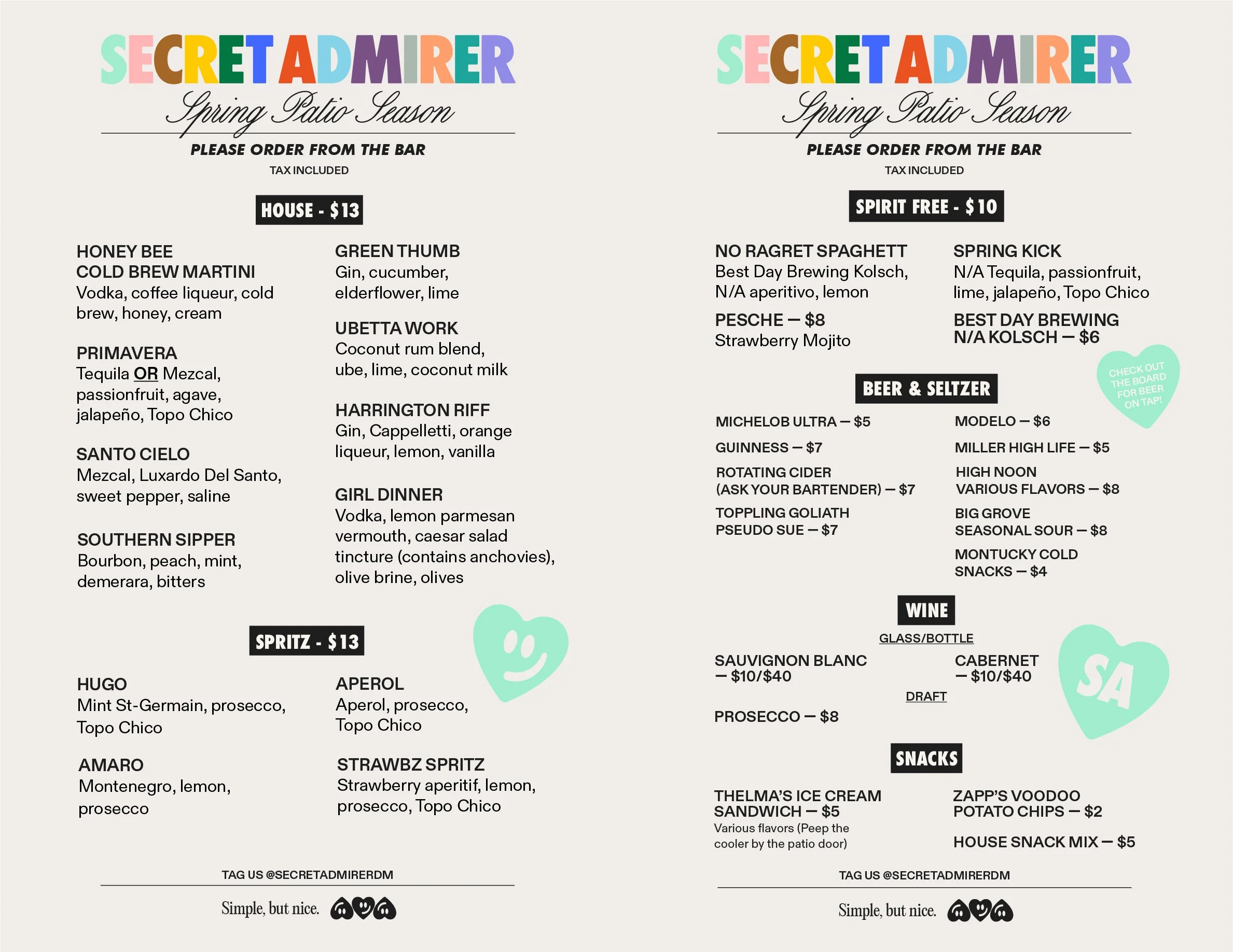 ABOUTSecret Admirer is a quaint and airy indoor bar with a skyline facing urban/garden/park-inspired patio. MENU Seasonal Menu CONNECT INSTAGRAM © 2026, DMDT Hospitality & Lifestyle.